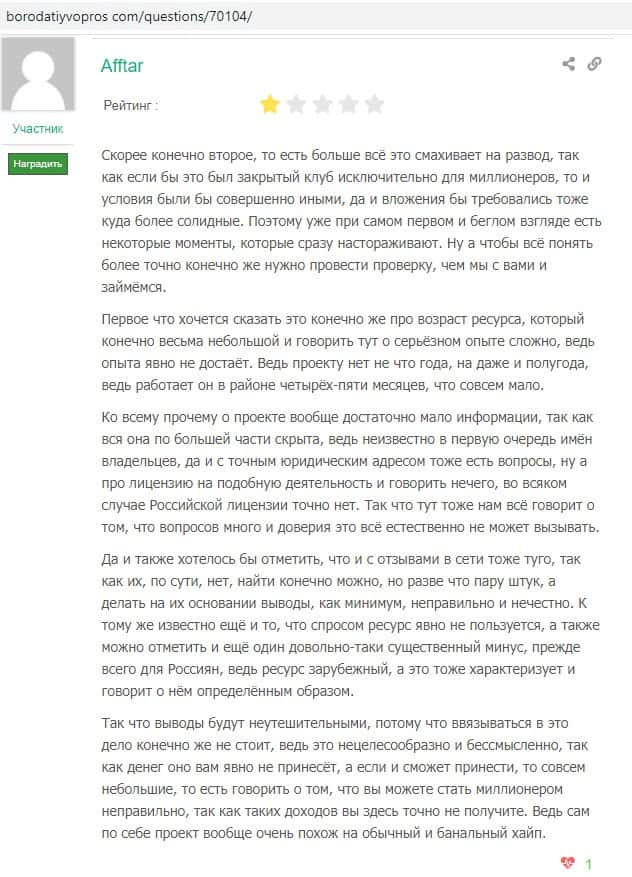 Следующий сайт в интернете говорит о том, что это тоже обычный лохотрон, который разводит на деньги в сети своих доверчивых клиентов. И с такими не стоит иметь дел.