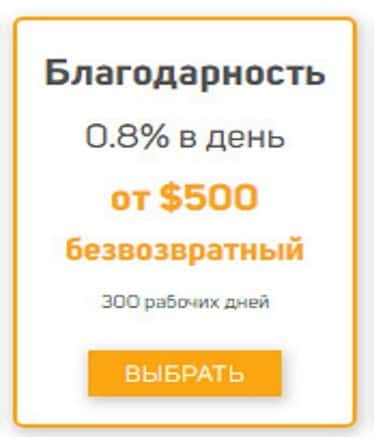Второй тип счета, в который предлагают вложиться жулики Infinite Warmth своим клиентам - это "Благодарность" с фиксированной ставкой 0,8% в день от 500$ инвестиций.