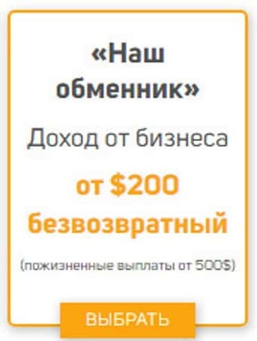 И последний лохотрон, в который предлагают вложиться жулики Инфинити Вармч - это "Наш обменник" с доходом от бизнеса и минимальной инвестицией от 200$.