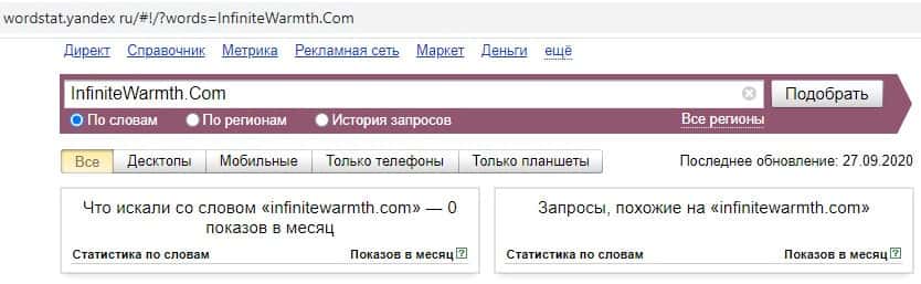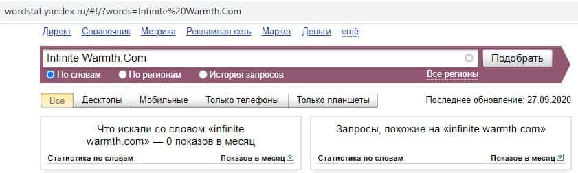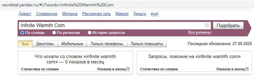 Такой же запрос в яндексе на английском только с одним пробелом и точкой "Infinite Warmth.Com" выдает результат в 0 показов в месяц, как и в предыдущем случае.