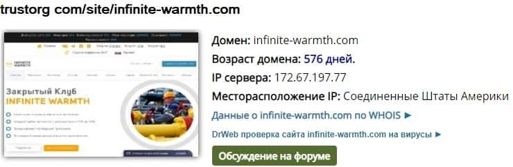 Проверка показывает, что возраст домена жуликов infinite-warmth com существует 576 дней. Это достаточный срок для того, чтобы обмануть много народа.