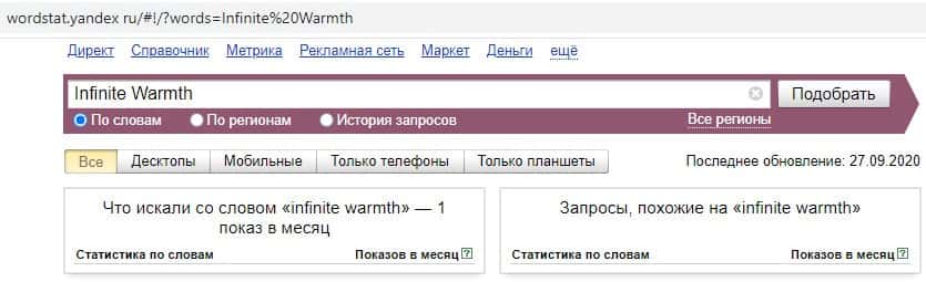Второй запрос на английском языке в Яндекс без пробела "InfiniteWarmth" выдает такой же результат, как и в предыдущем случае - 0 показов в месяц.