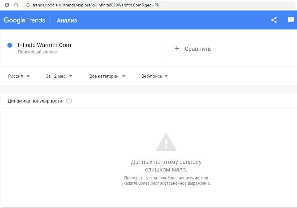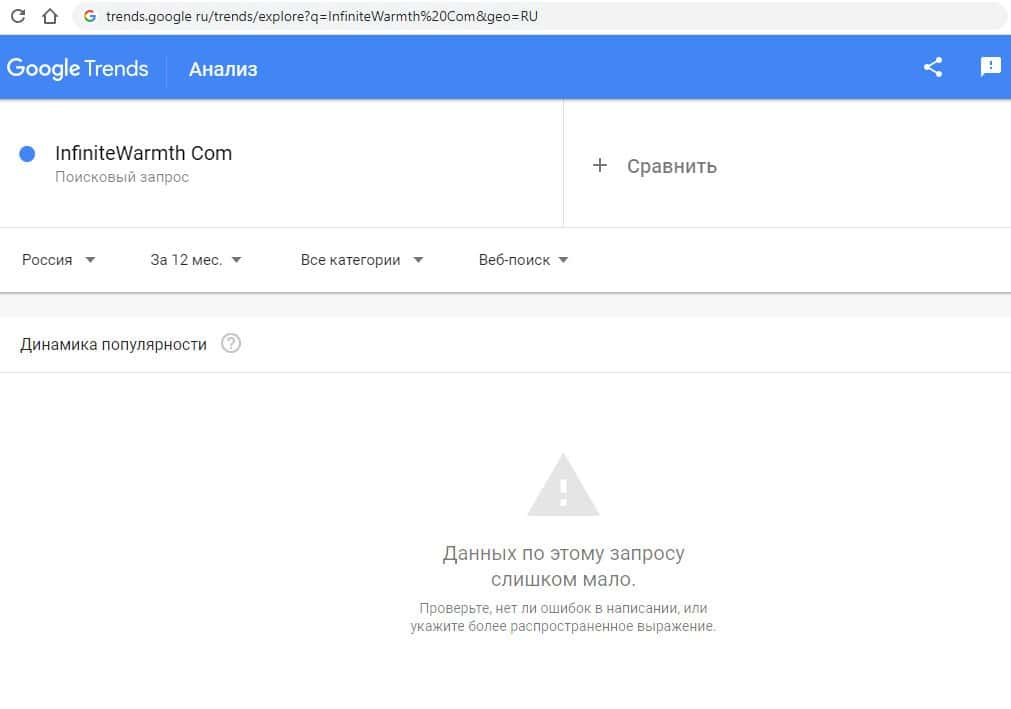 Такой же запрос в Гугл на английском языке только с одним пробелом "InfiniteWarmth Com" выдает 0 показов в месяц. Так информацию о мошенниках никто не ищет.