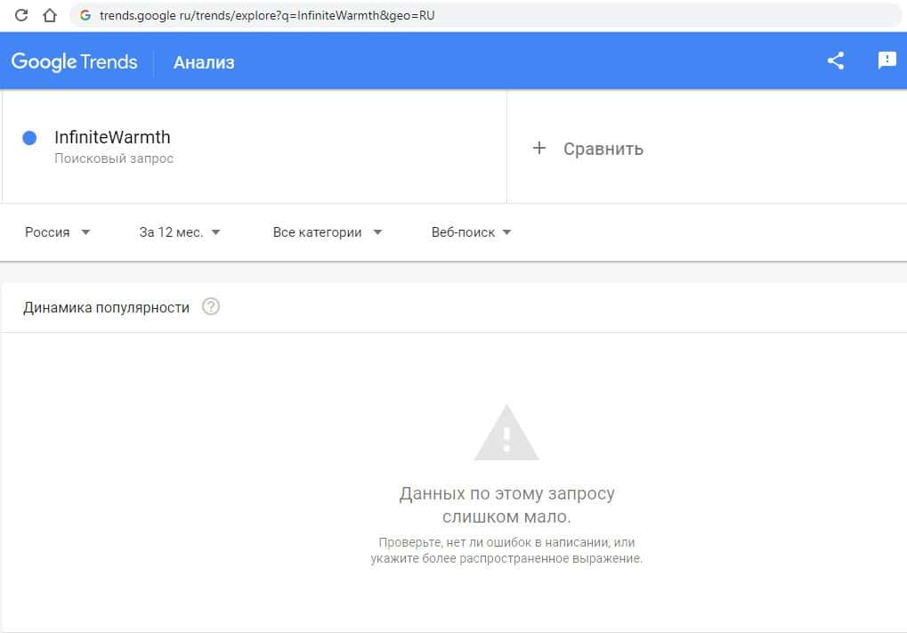 Третий запрос в Гугл на английском языке "Infinite Warmth Com" с двумя пробелами выдает точно такой же результат, как и в предыдущем случае - 0 показов в месяц.