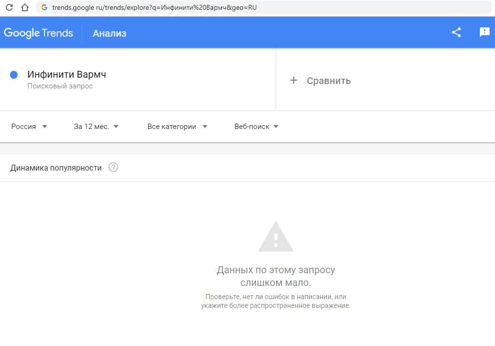 Переходим к запросам на русском языке. Первый запрос на русском языке в Гугл с одним пробелом "Инфинити Вармч" выдает результат в 0 показов в месяц.