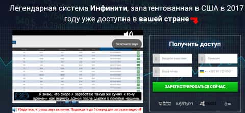 Начинается страница у лохотрона Инфинити Апп с громкоговорящей надписи о том, что мошенники Infinity App предлагают получить огромную сумму денег всего то за просмотр видео на их подвальном сайте годовалого типа. На изображении, расположенном ниже, вы можете увидеть предложение на сайте аферистов Инфинити Апп.