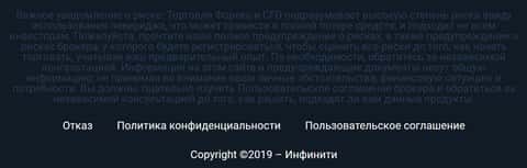 Завершается сайт у проходимцев Инфинити Апп ссылками на документы и предупреждением о рисках, в которых жулики Infinity App говорят об опасности торговли форекс и CFD, тем самым отказываясь от дальнейшей ответственности за будущие потери клиентов. На изображении, расположенном ниже, вы можете окончание сайта жуликов Инфинити Апп.