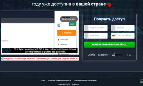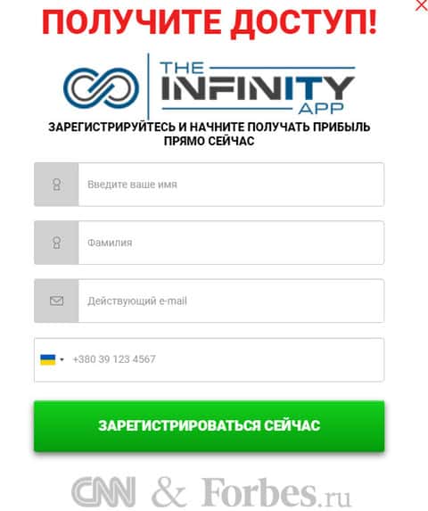 Сразу после входа из-за кривого кода сайта лохотрона Инфинити Апп вам начнет маячить всплывающая форма регистрации, которая будет маячить у вас пытаясь взять контактные данные. На изображении, расположенном ниже, вы можете увидеть всплывающую форму с годовалого сайта жуликов Infinity App.