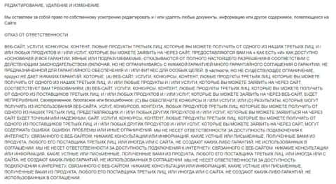 Далее практически все условия сотрудничества у аферистов Инфинити Апп состоят из "воды" о разных моментах работы шулеров. Но вот заканчиваются условия у мошенников Infinity App информацией о том, что аферисты могут в любой момент изменять данные условия, а так же что лохотрон Инфинити Апп отказывается от ответственности за услуги, предоставленные ими.
