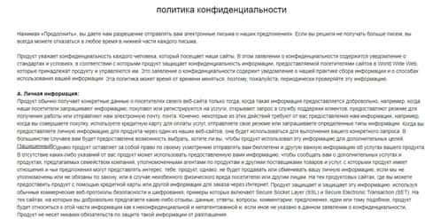 Политика конфиденциальности у шулеров Infinity App, аналогично клиентскому соглашению представлена на английском языке по вышеупомянутым причинам. Начинается она по своей сути с "воды", о том что лохотрон Инфинити Апп собирает информацию клиентов и хранит ее. На изображении ниже вы можете увидеть начало политики конфиденциальности шулеров.