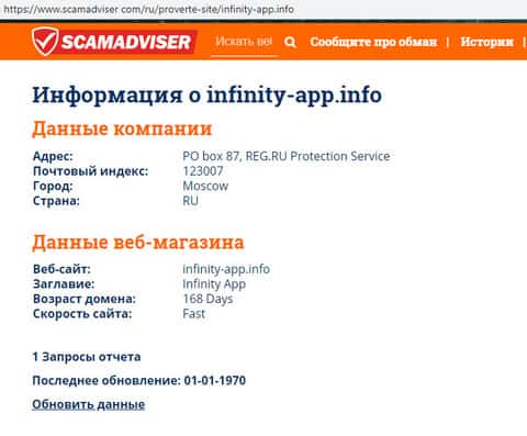 В связи мошеннической и противозаконной деятельность лохотрона Infinity App его руководители предпочитают анонимность дабы избежать ответственности со стороны правоохранительных органов, которые явно будут против деятельности данного хайпа. Ниже вы можете увидеть информацию о сайте мошенников Инфинити Апп с портала scamadviser com.