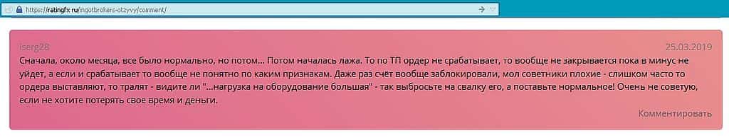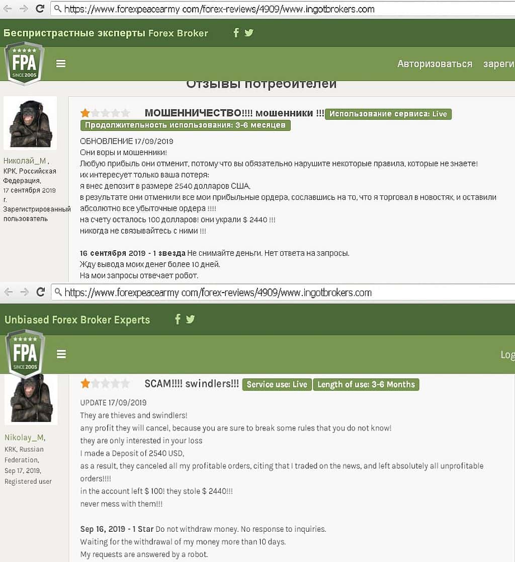 Обманутые жуликами из INGOT Brokers трейдеры предупреждают коллег не связываться с этой конторой. На портале forexpeacearmy com один из них рассказывает о том, как у него украли 2400 долларов, сославшись на то, что он нарушил какое-то правило. Естественно, причина была выдумана и в клиентском соглашении такого правила не было.
