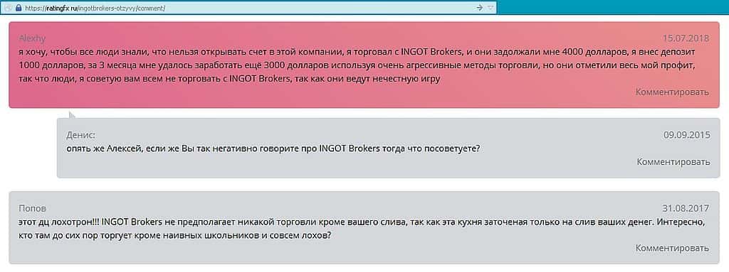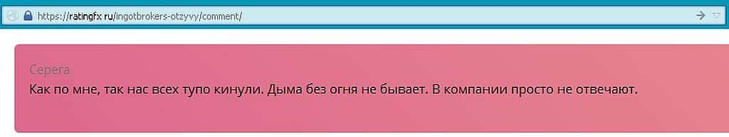 Некоторым обманутым трейдерам аферисты INGOT Brokers даже не считают нужным отвечать. Они перестают реагировать на письма, звонки, и не подтверждают вывод средств. Таких случаев немало: трейдеры, которых кинули мошенники из ИНГОТ Брокерс, собрались на форуме ратингфикс ру, чтобы поделиться своими историями.