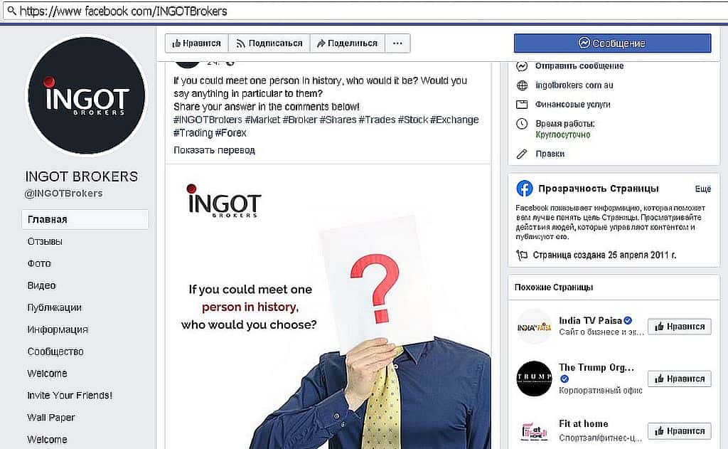 В социальных сетях мошенники INGOT Brokers постят финансовые новости, и так доступные и известные всем трейдерам или опросы из разряда: "Если бы вы могли встретиться с исторической личностью, кто бы это был". Все страницы кидал INGOT Brokers - это развлекательные порталы, "замануха", не более того.