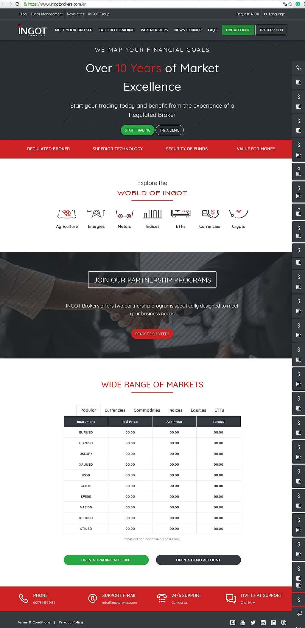 Сайт конторы ИНГОТ Брокерс на первый взгляд кажется презентабельным. Доступен на английском, испанском и арабском. Присутствуют разделы контактов, новостей, описание платформ и условий торговли, партнерских программ. Аферисты INGOT Brokers заманивают новичков обещаниями прибыли на базе рынков валют, индексов и акций.