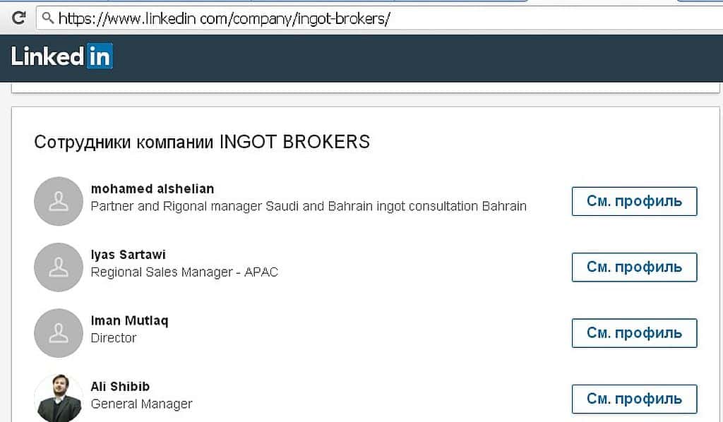 В популярной деловой сети Linkedin жулики INGOT Brokers тоже засветились. Здесь они - серьезная компания с 10-летним стажем. Становится понятно, почему на сайте доступен арабский язык. Имена сотрудников звучат так: Mohamed Alshelian, Iyas Sartawi, Iman Mutlaq, Ali Shibib. При этом фото есть только у менеджера - контактное лицо, видимо.