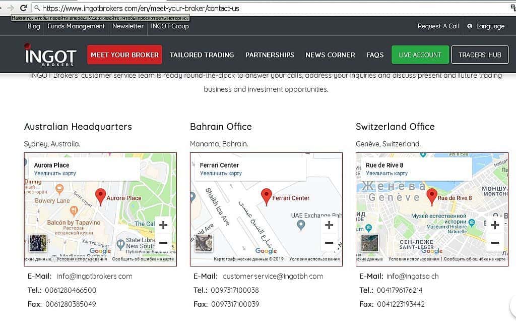 Мошенники ИНГОТ Брокерс предлагают несколько способов связи с ними, в том числе через онлайн-формы. У конторы якобы аж три представительства, в Австралии, Бахрейне, Швейцарии. Правда, когда доходит до того, чтобы вывести заработанное, ни один из номеров не отвечает. Контакты мошенников: