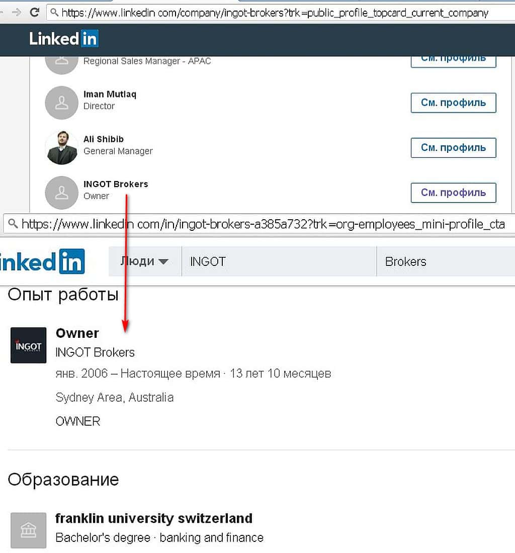 Ожидаемо, что на сайте нет никакой информации о предводителях аферистов INGOT Brokers. Зато она есть на Linkedin - директором там указан Iman Mutlaq, генеральным менеджером - Ali Shibib, и есть еще загадочный "Owner", о котором известно только то, что он окончил (якобы) колледж Франклина и находится в Австралии.