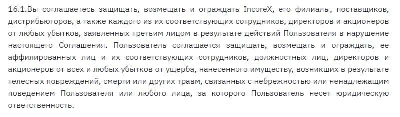Контора Инкорекс обязывает клиента защищать, возмещать, а также ограждать их от любых убытков, которые могут возникнуть в процессе сотрудничества с ними.