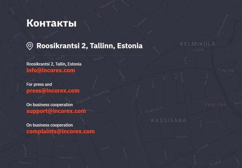 Далее представлены контактные данные мошеннической конторы Инкорекс, где вы можете увидеть несколько электронных почт для связи с ними, а также адрес регистрации в Эстонии: