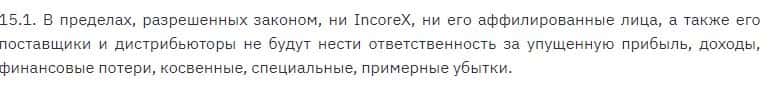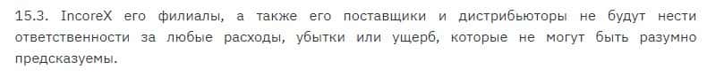Лохотронская организация Incorex не будет нести ответственности за любые расходы, убытки и ущерб, которые клиент будет нести в процессе пользования их услугами.