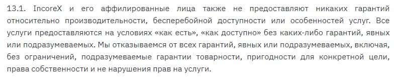 Мошенники Incorex не дают никаких гарантий своим клиентам, так как они предоставляют некачественные услуги и в случае чего, попросту не будут за это отвечать.