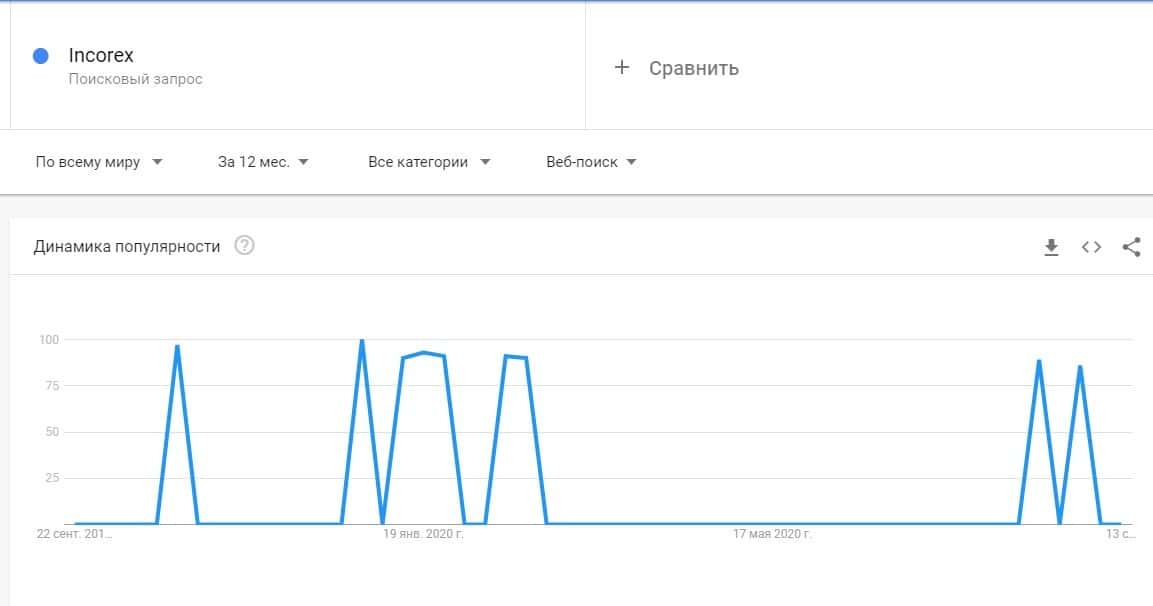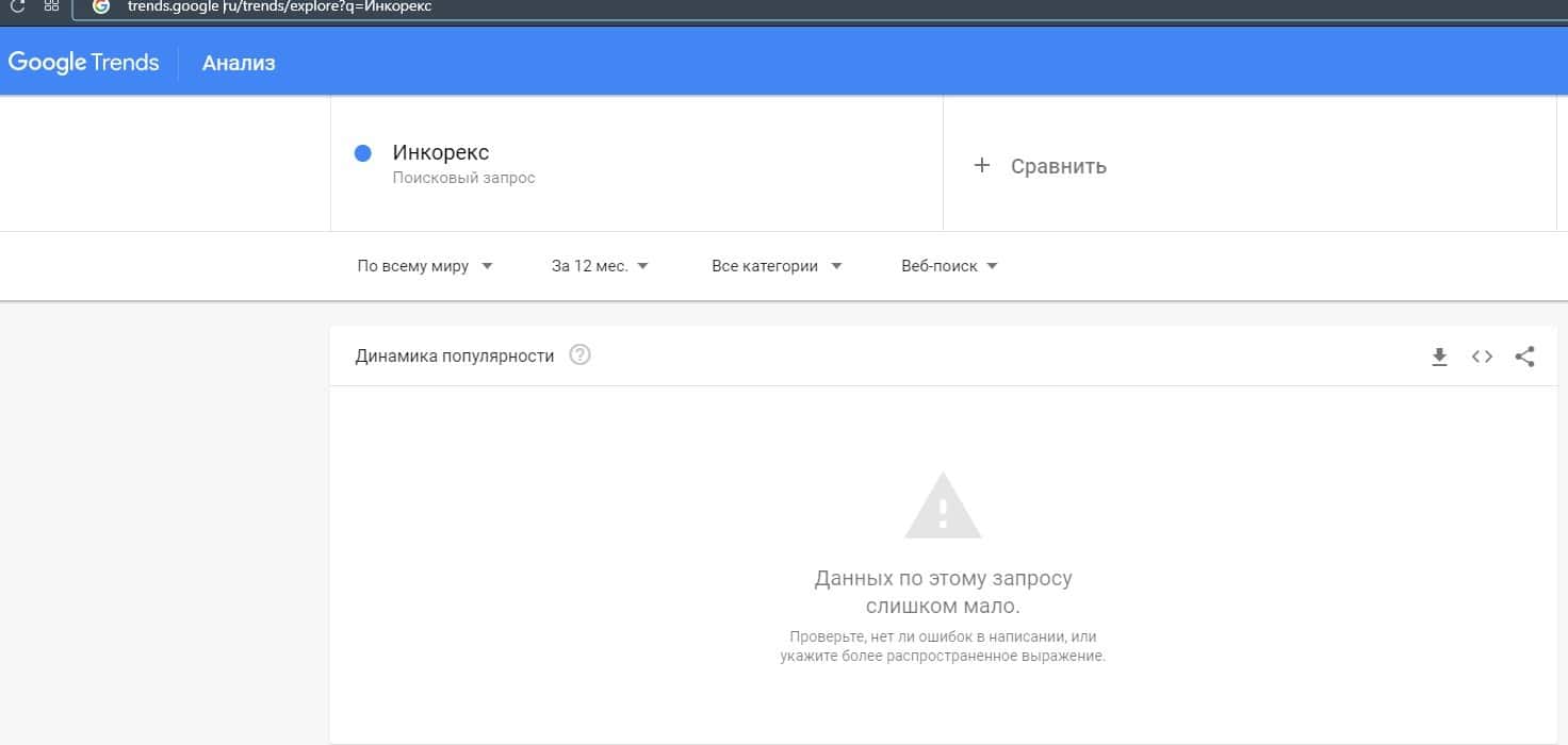 Бренд конторы "Инкорекс" в Гугл не искались ни разу, поэтому данный лохотрон можно считать не популярным в интернете вообще.
