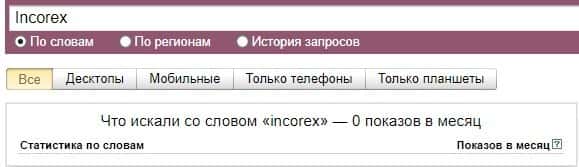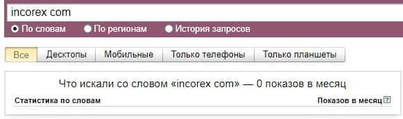 По поводу бренда сайта лохотрона "incorex com" без точки не популярны и по версии Яндекс Вордстат не смогли набрать ни единого показа за последний месяц.