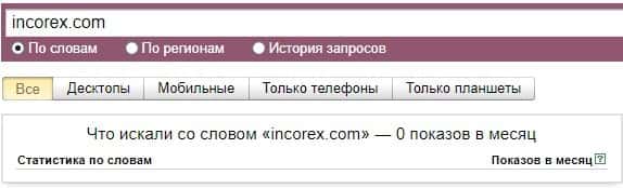 Та же ситуация и по бренду сайта "incorex.com" только уже с точкой. Очень мало запросов в поисковой системе Яндекс по этой версии написания сайта.
