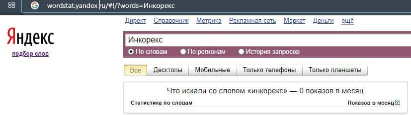 Запросы бренда "Инкорекс" не популярный в поисковой системе Яндекс, но он создан как раз для русскоязычного населения.