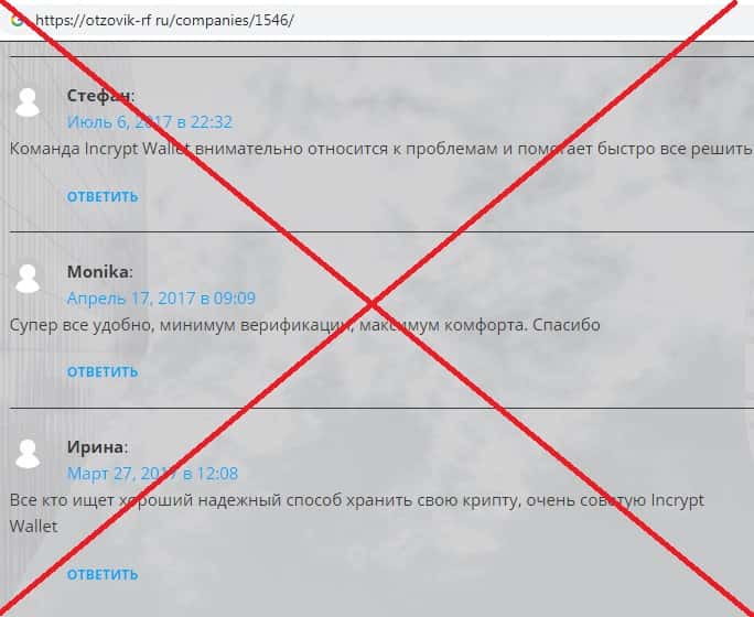 На сайте-отзовике отзовик-рф ру обнаружены фальшивые комментарий о скам-организации Инкрипт Валлет. На форумах рядом с реальными отзывами шулера опубликовывают лживые комментарии таким образом себя расхваливая. Верить мошенникам нельзя, поскольку все отзывы написаны по стандартному шаблону, что очень трудно не заметить.