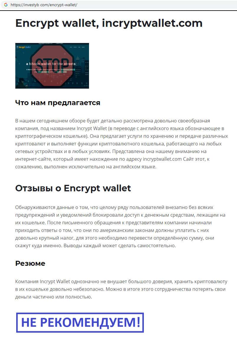 На интернет-портале инвестиб ком замечена статья-отзыв об аферистах Инкрипт Валлет, сайт которых не внушает доверия и поэтому хранить криптовалюту на их сайте не рекомендуем !!! В глобальной сети-интернет очень мало действительно достоверной информации о компании, поэтому доверять подобного рода сомнительным компаниям нельзя.