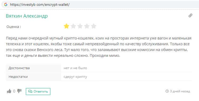 На интернет-ресурсе investyb com обнаружен пользовательский отзыв о скам-проекте IncryptWallet, автор которого некий Александр пишет о том, что достоинств у данной конторы нет и не было, а главным недостатком является то, что мошенники требуют оплатить высокие комиссии на обмен криптовалюты, а деньги вывести вообще нереально.