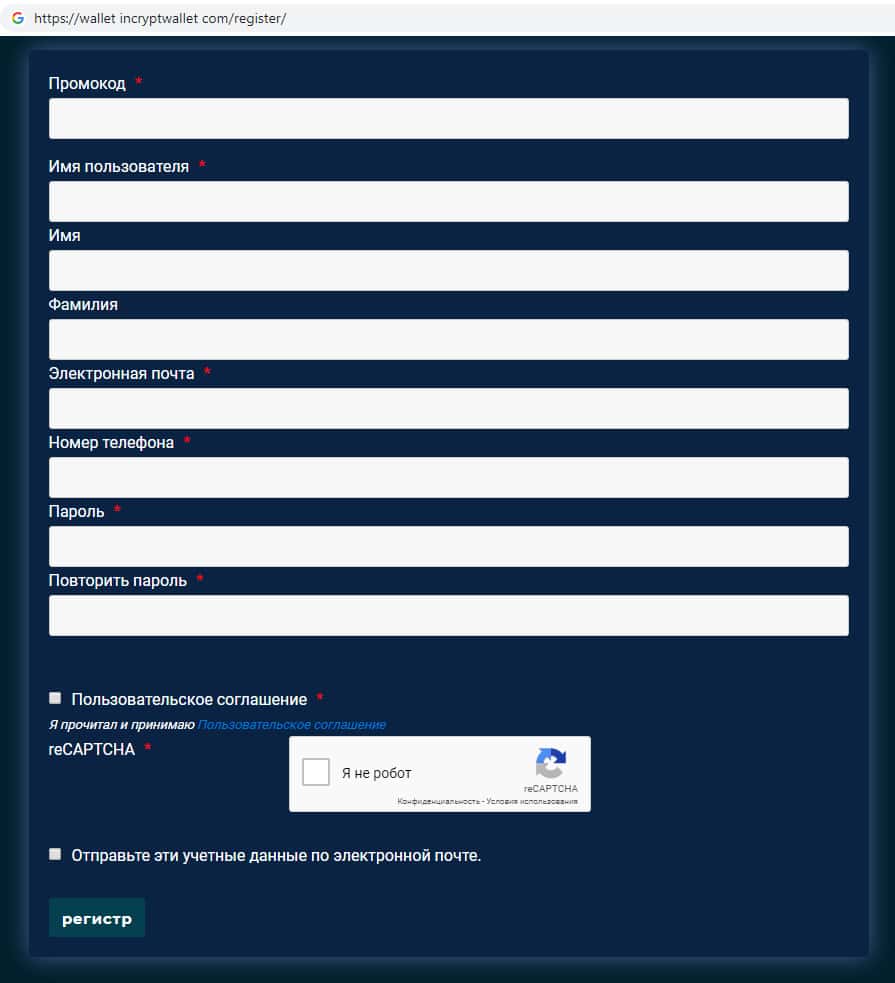 Для того, чтобы зарегистрироваться на сайте мошенников IncryptWallet необходимо назвать логин,имя, фамилию адрес электронной почты, контактный номер телефона и пароль, и конечно же подтвердить то, что Вы соглашаетесь с условиями пользования сайтом. Прежде чем поставить галочку в данной форме, подумайте стоит ли так рисковать своими деньгами?