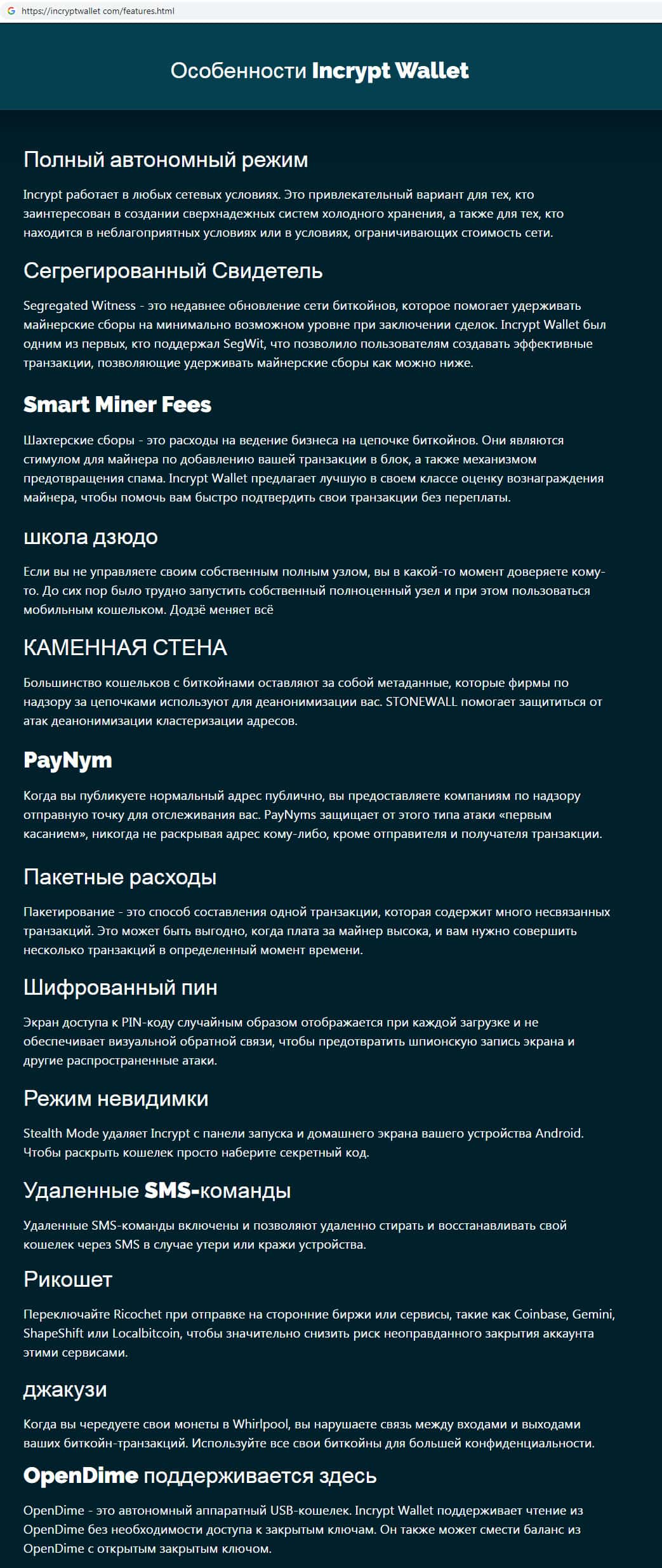 Интернет-ресурс шараги IncryptWallet переводится с грамматическими ошибками, что естественно недопустимо для серьезной организации. Это является весомым аргументом для того, чтобы не регистрироваться на сайте жуликов, которые лишь вешают лапшу на уши о надежности своего криптовалютного кошелька.