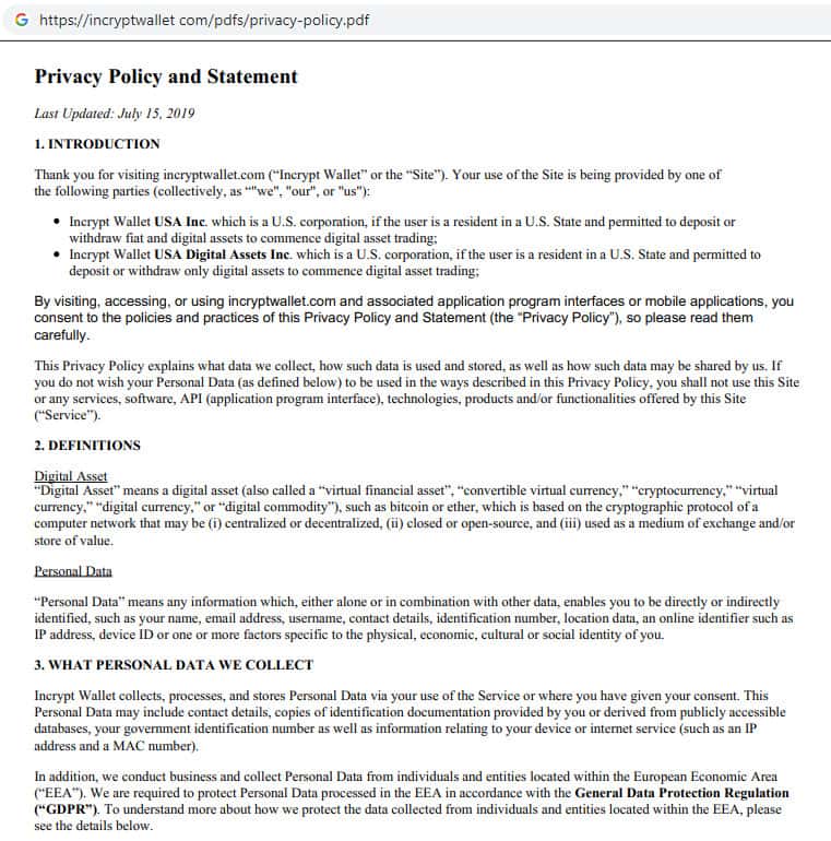 - Политика конфиденциальности на сайте мошеннической организации Инкрипт Валлет