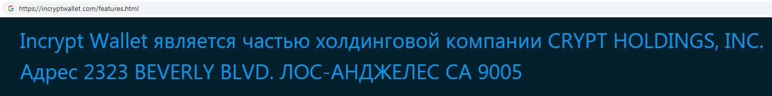 Согласно контактной информации, которую указывает о себе скам-организация Инкрипт Валлет является частью холдинговой компании CRYPT HOLDINGS находится городе на юге Калифорнии, в Лос-Анджелесе. Где ныне базируется огромное количество аналогичных компаний.