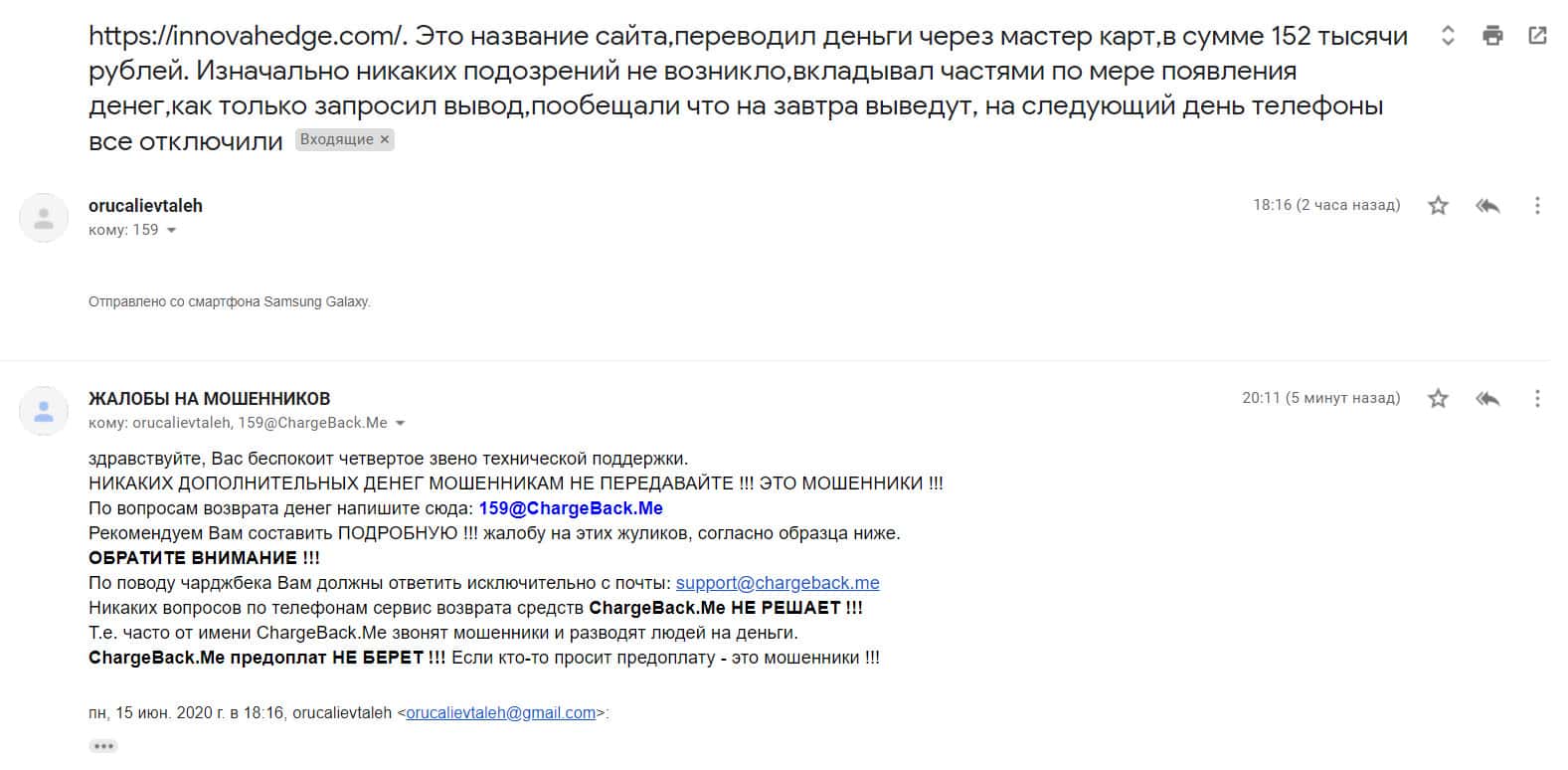 На емайл сайта, разоблачающего деятельность мошенников в сети Интернет, пришла жалоба и на криптовалютный лохотрон Иннова Хедж, обманутый клиент сообщил об утрате 152 тысяч рублей.