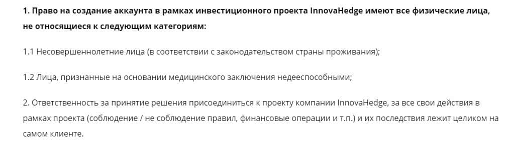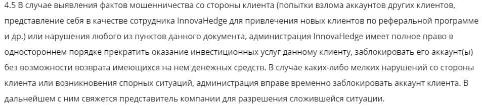 В своем клиентском соглашении, криптовалютные шулера Иннова Хедж указывают, что за все действия и убытки, которые понесет клиент в процессе сотрудничества с ними, несет ответственность клиент. Лохотрон полностью себя огораживает от каких-либо компенсаций и судебных разбирательств, которые вообще по закону, могут быть применены.