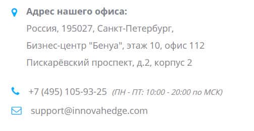 Криптовалютный хайп InnovaHedge не поскупился на контактную информацию и решил опубликовать не только электронную почту и форму обратной связи, а и телефон и адрес офиса в Москве. Но уверяем, что не стоит спешить с выводами касательно их открытости. И все же советуем ознакомиться с этими данными: