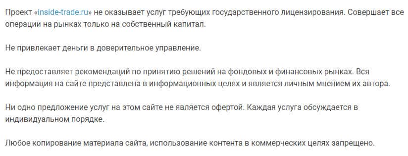 В следующем разделе "Уведомление о рисках" интернет-площадки Inside-Trade речь идет о том, что эти проходимцы с юридической точки зрения обезопасили себя со всех сторон, как бы прискорбно это ни звучало. Ни лицензии, каждая услуга обсуждается отдельно в каждом случае. В общем, обходить лучше стороной таких махинаторов, как Инсайд Трейд.