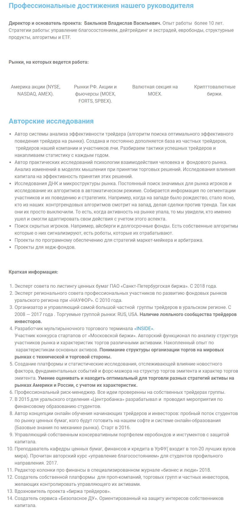 По данным, которые содержатся на официальном веб-сайте шулерской брокерской компании Inside-Trade, директором и основателем данного шарашкиного проекта является некий Баклыков Владислав Васильевич. Но его фотографию почему-то на веб-сайте не разместили. Затем перечисляются его достижения, которые неизвестно чьи вообще на самом деле.