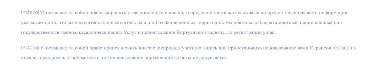 Далее контора Инста Коинс пишет, что имеет право запрашивать у клиента документы, подтверждающие его адрес и место жительства. Также она может заблокировать его.