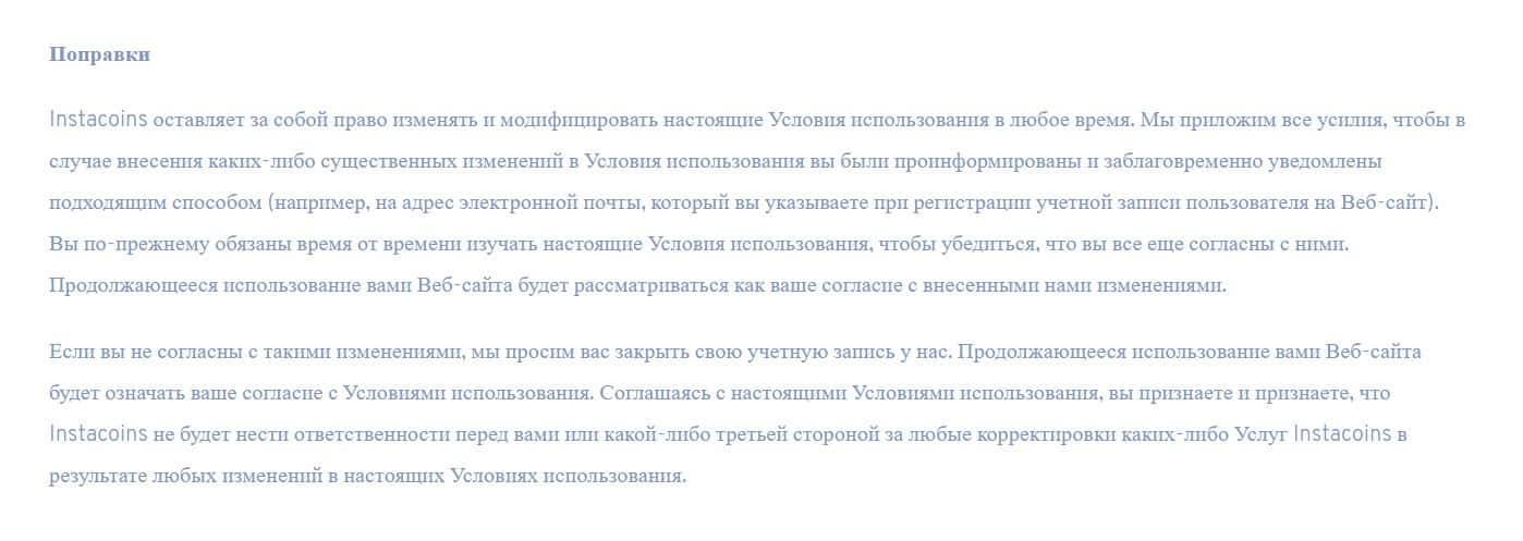 В разделе Поправки компания Инста Коинс говорит о том, что может вносить изменения в свой договор в любое время.