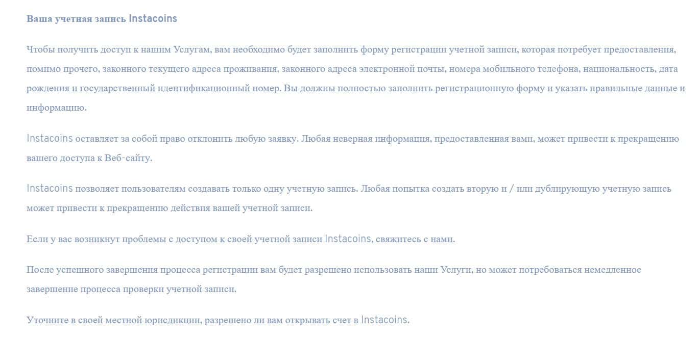 В разделе об учетной записи клиента компания InstaCoins утверждает, что может отклонять заявки пользователей о регистрации на сайте без видимых на то причин.
