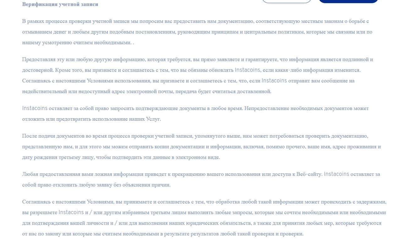 Прочитав раздел Верификация, клиент обязан согласиться с правилами компании Инста Коинс по проверке личности пользователя.