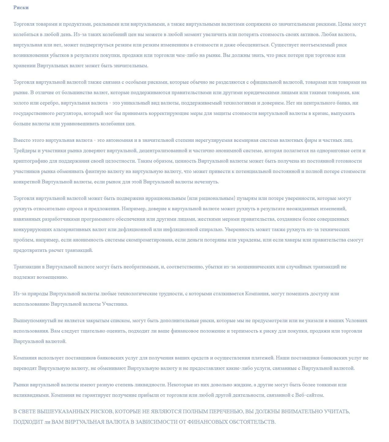 Раздел под названием Риски предупреждает пользователей о том, что виртуальная валюта является высокорисковым инструментом и клиент должен быть готов к потерям из-за этого.