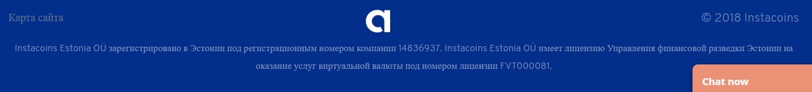 Юридическим лицом, действующим от имени компании InstaCoins, является организация Instacoins Estonia OÜ, зарегистрированная в Эстонии.