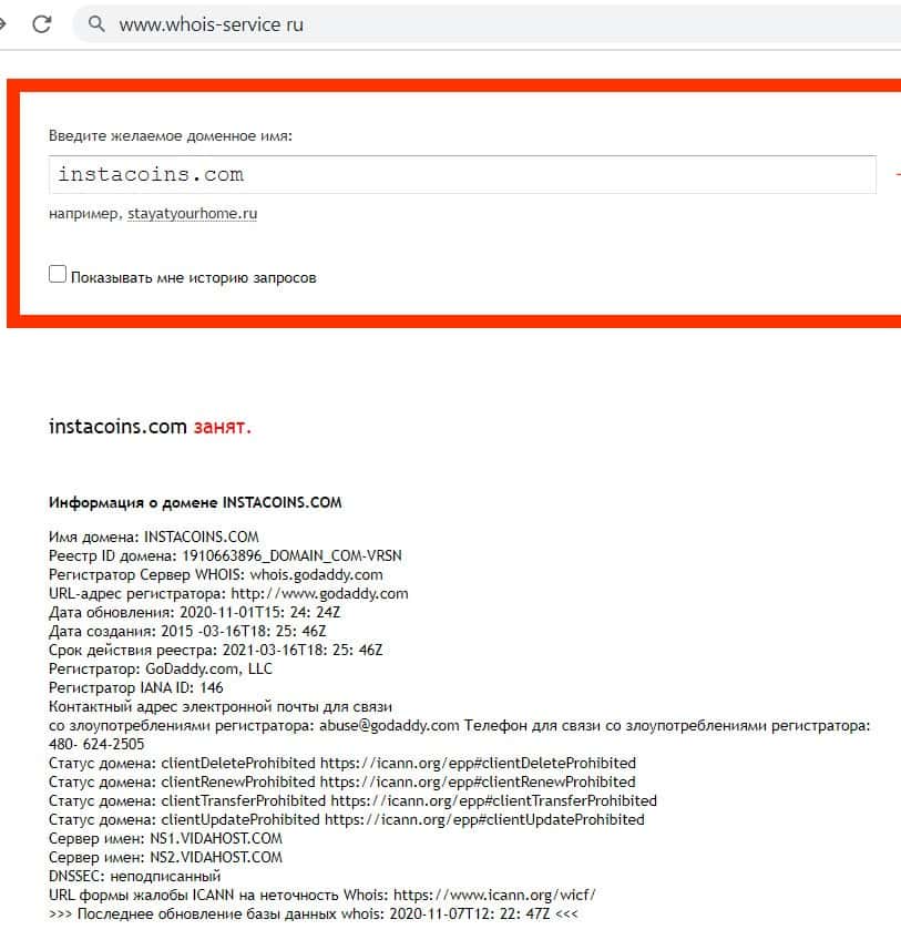 Не удалось выяснить, кто владелец доменного имени instacoins com, потому что мошенники, создавшие сайт, скрывают всю информацию об этом.