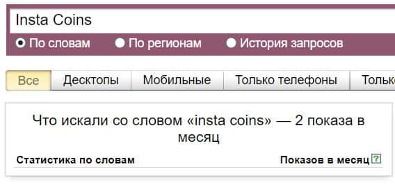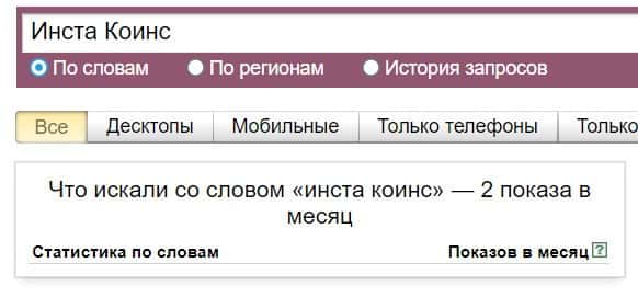 Посмотрим, сколько раз люди искали название бренда "Инста Коинс" на русском языке с пробелом: 2 раза за месяц.